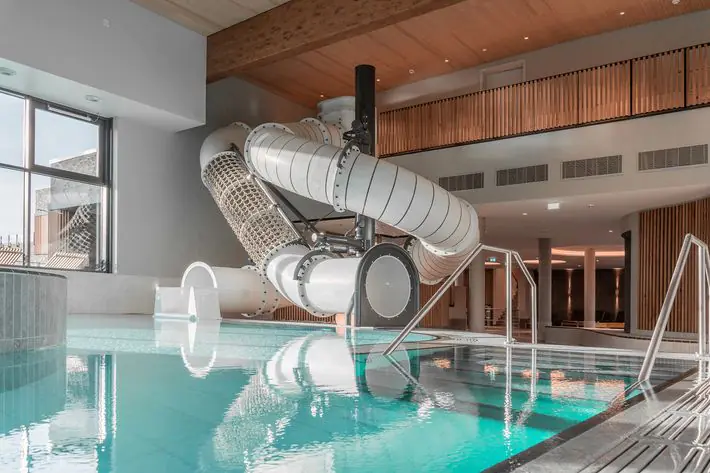 Der großzügig angelegte Poolbereich im Erdgeschoss bietet Badespaß und Erholung für die ganze Familie. Neben dem Kleinkindbereich, dem Familien- und Außenbecken sowie einer Wasserrutsche stehen ein Imbiss und eine Textilsauna zur Verfügung.