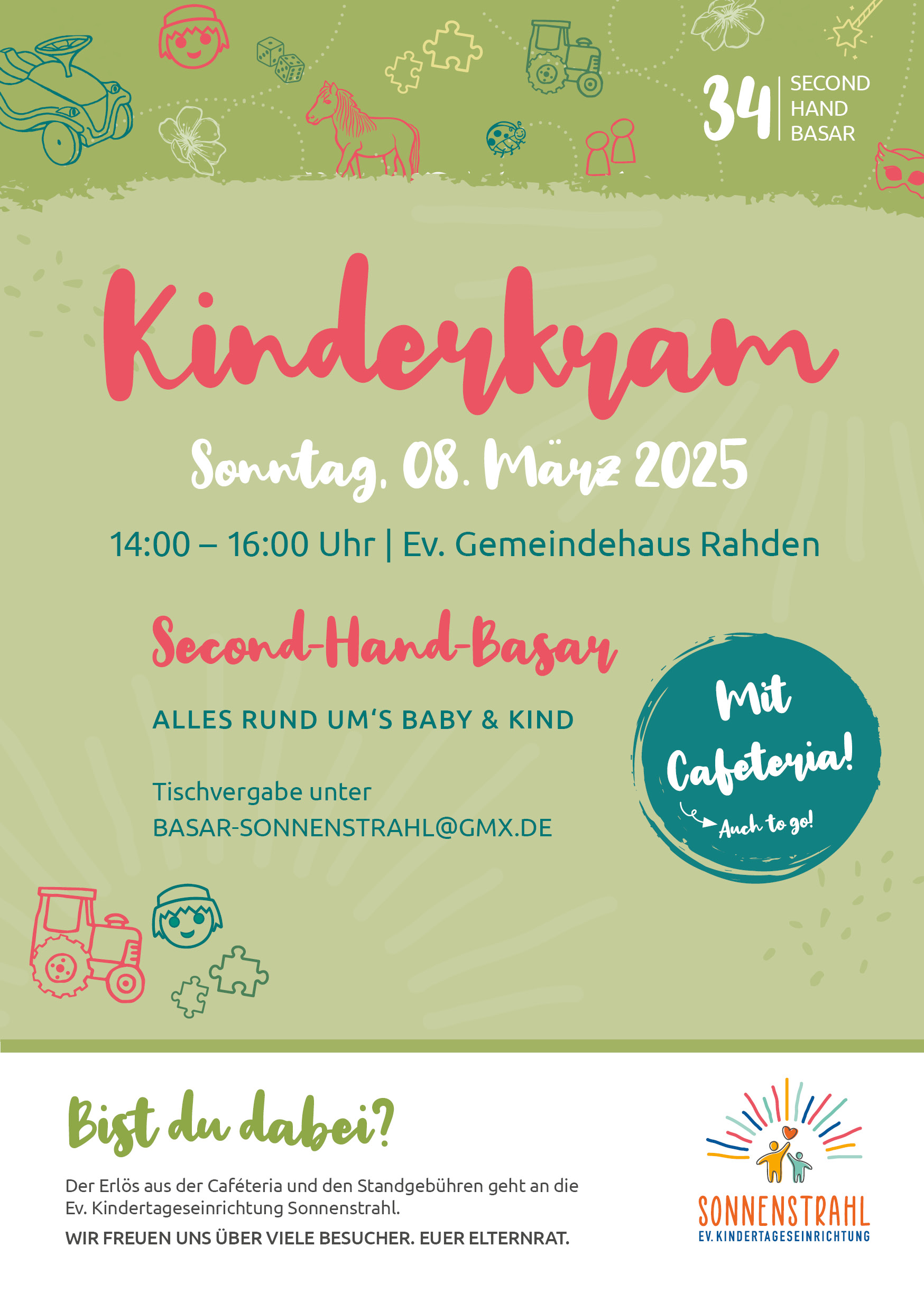 Kinderkram-Fans aufgepasst! Am Sonntag, den 08. März 2026, findet von 14:00 bis 16:00 Uhr im Ev. Gemeindehaus Rahden ein toller Second-Hand-Basar statt – ALLES RUND UM'S BABY & KIND! Hier hast du die Möglichkeit, viele schöne Dinge für die Kleinen zu entdecken und vielleicht das ein oder andere Schnäppchen zu machen.