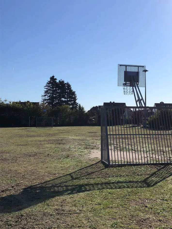 Der Bolzplatz in der Goethestraße liegt auf einer großen Rasenwiese. Es gibt neben en zwei Toren auch zwei Basketballkörbe.