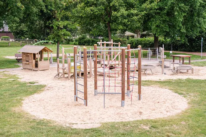 Der Spielplatz ist mit folgenden Spielgeräten ausgestattet:Rutsche Röhrenrutsche Schaukel Reifenschaukel Wippe Wederwippgerät Drehelement Seilbahn Wackelbrücke Trampolin Kletterelement Hangelgerät