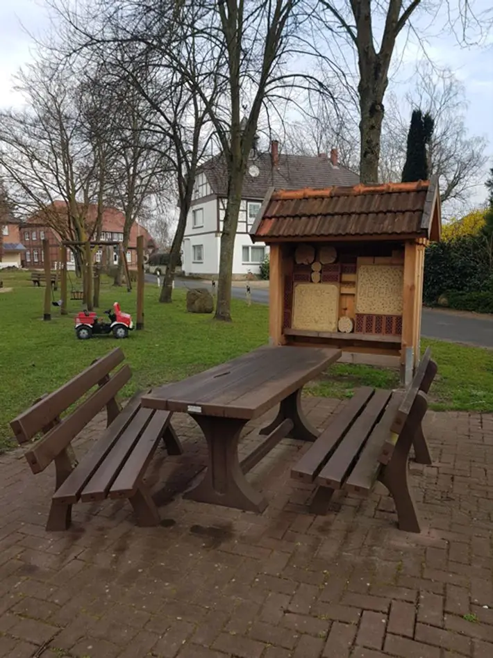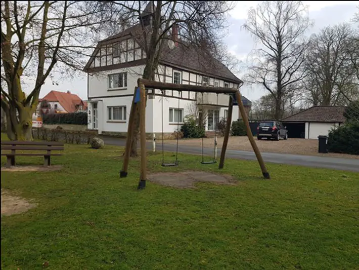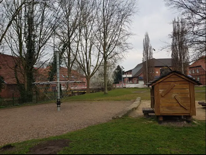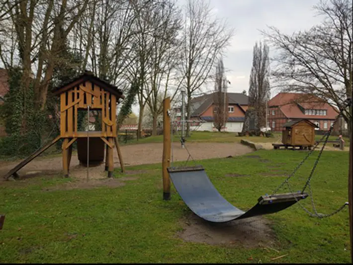 Der Spielplatz am Amtshof ist gemütlich gelegen und mit Bäumen geschmückt. Der Spielplatz verfügt über mehrere Sitzmöglichkeiten, eine Doppelschaukel, ein Klettergerüst in Kokon-Form, ein Spielhaus direkt am Sandkasten. eine Hängematte, einen kleinen Kletterturm, eine Kleinkinderschaukel, ein Spielauto und ein interessantes Insektenhotel.