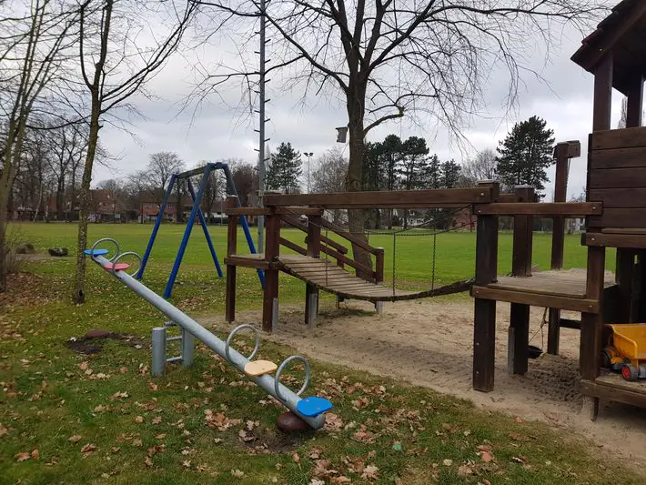 Der Spielplatz ist umgeben von grünem Rasen. Auf der Sandfläche in der Mitte des Spielplatzes gibt es einen breiten Spielturm mit Wackelbrücke, Rutsche und Sandspielzeugen. Daneben befindet sich eine Wippe auf der bis zu vier Kinder spielen können. Für die Eltern gibt es nah am Geschehen zwei Bänke mit einem Tisch.