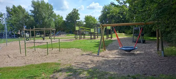 Direkt an der Grundschule gibt es einen schönen Spielplatz mit verschiedenen Spielgeräten. Es gibt ein Klettergerüst, Balanceelemente und eine Tischtennisplatte.