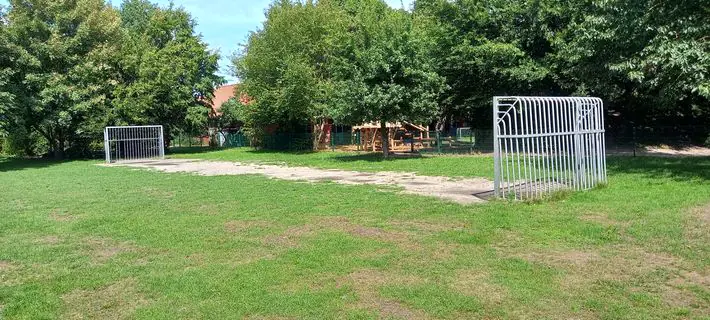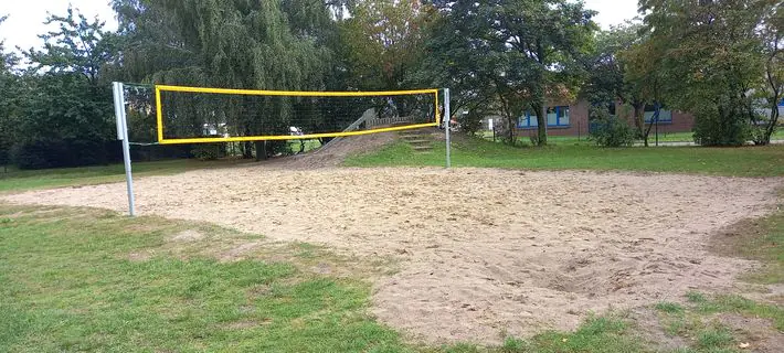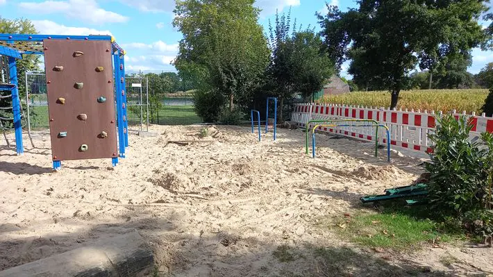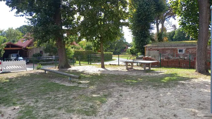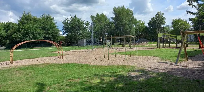 Direkt an der Grundschule gibt es einen schönen Spielplatz mit verschiedenen Spielgeräten. Es gibt ein Klettergerüst, Balanceelemente und eine Tischtennisplatte.