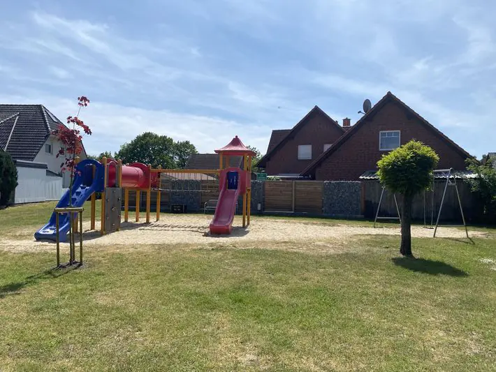 Kleiner Spielplatz mit Spielburg, die mit Rutsche, Wackelbrücke, und Klettermöglichkeiten ausgestattet ist, sowie eine Schaukel