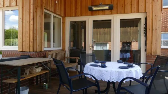 Vom Hof mit dem PKW- Stellplatz gelangen Sie barrierefrei über die Rampe zur möblierten Terrasse (20 qm) und von dort ins Erdgeschoss (56 qm) mit voll ausgestatteter Küche, dem Ess- und Wohnbereich mit Schlafcouch (1,40 x 2,0 m Liegefläche) .