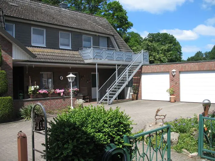 FeWo mit separatem Eingang über eine Außentreppe und kleinem Balkon. Die Wohnung ist 85m² groß, verfügt über zwei Schlafzimmer, ein Wohnzimmer, eine Küche und ein Badezimmer mit Wanne und Dusche.