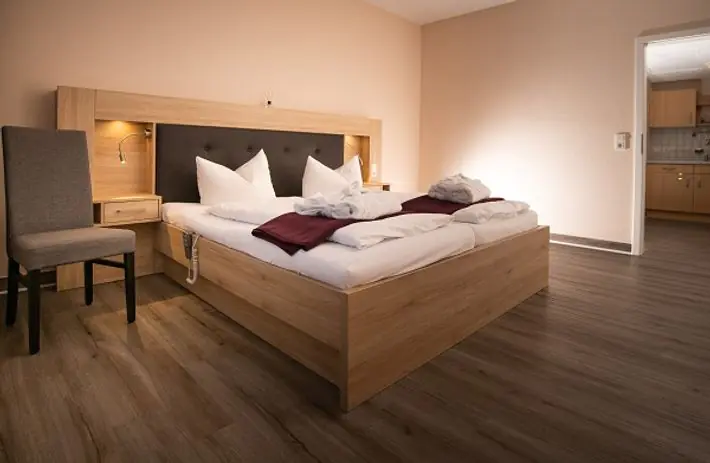 Unser Hotel Garni verfügt über 2 moderne Ferienwohnungen. Die Ferienwohnung Parterre ist rollstuhlfreundlich. Die andere Ferienwohnung befindet sich im 1. OG. Als unser Gast kommen Sie in den Genuss die komfortable Ausstattung inkl. Service unseres Hotel Garni*** zu genießen: Frühstücksbuffet, Zimmerservice, Maxibar, Grillabende, Biergarten oder entspannen Sie in unserer schönen Gartenanlage mit Teich, Strandkörben und Sonnenterrassen.