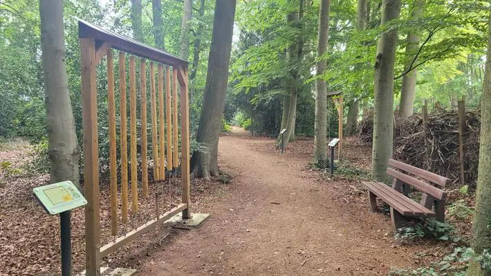 Spielplatz befindet sich im Wald, grenzt an den Fitnesspark; Seilbahn, Schaukel, Klettergeräte, Turnstangen, Hangelgerät