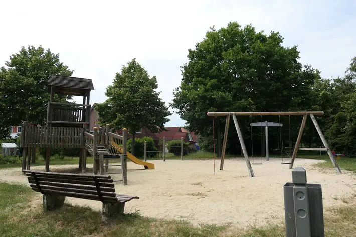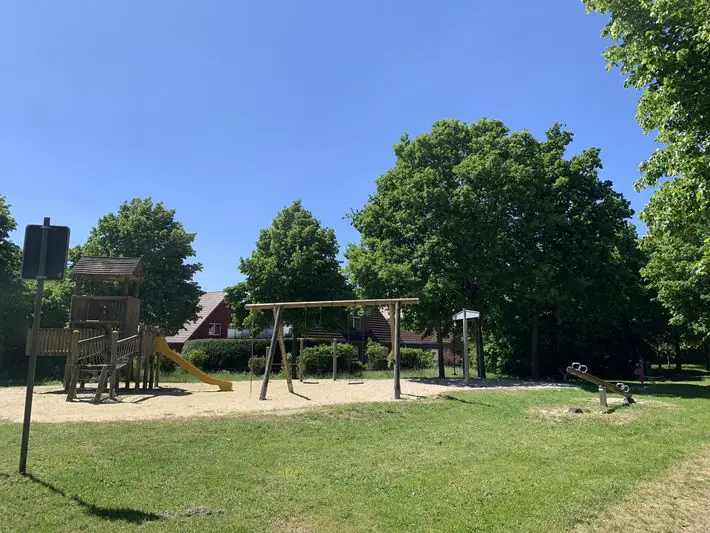 Der Spielplatz liegt auf einer Sandfläche, auf der verteilt Schaukeln, eine Rutsche, eine Wippe, ein Kletterturm, eine Karussell-Schaukel und Sitzgelegenheiten zu finden sind.