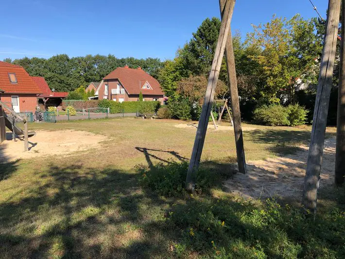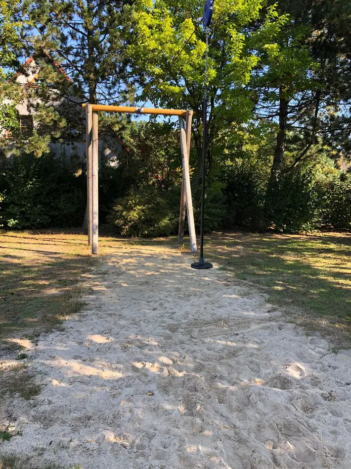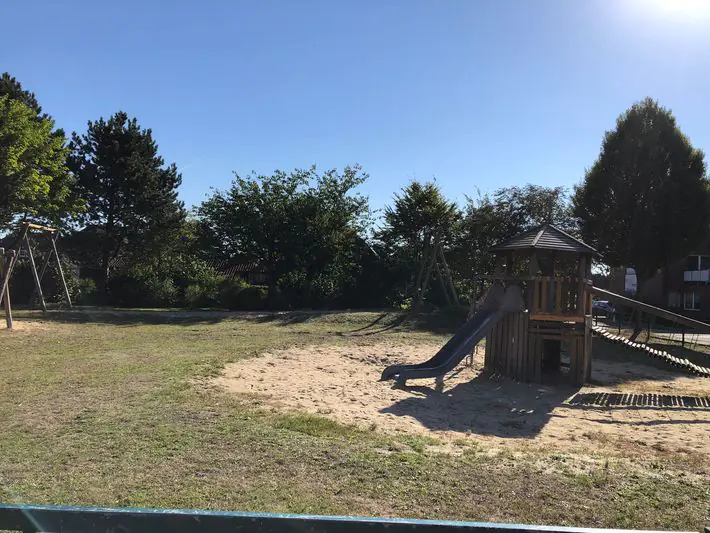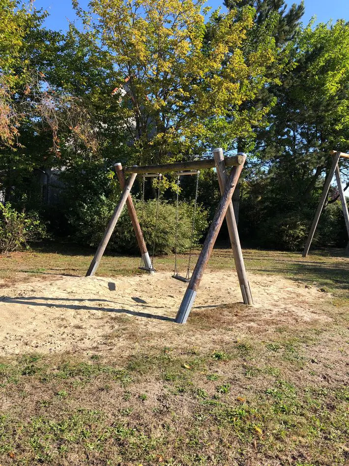 Der Spielplatz in der Schlegelstraße hat eine Seilbahn, eine Doppelschaukel und einen Turm mit Rutsche, Hangelbalken und Wackelsteg.
