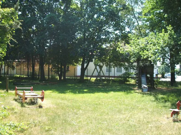 der Spielplatz hat eine Federwippe, eine Schaukel, eine Rutsche, ein Reck und Balncierelemente.